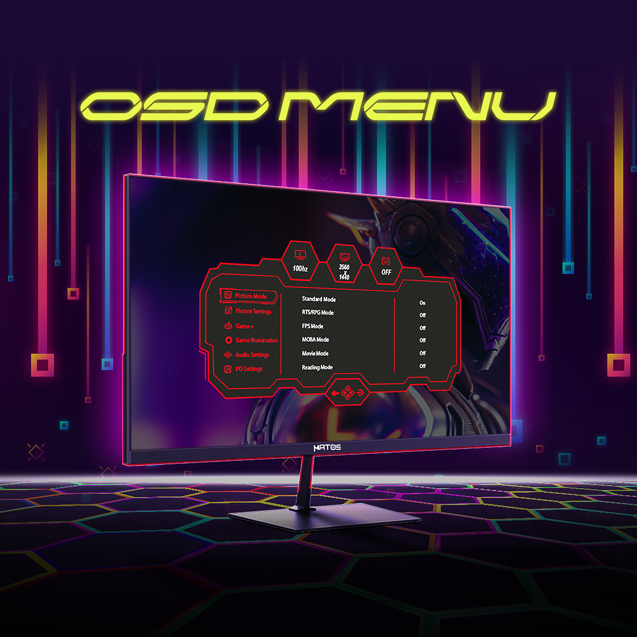 Gaming Monitor Matos Rainbow ,  IPS TECHNLOGY, Dimension 24″ 2k 1440p monitor with ADAPTIVE SYNC technology .  Featuring 100Hz refresh rate speed, 1ms response time, New OSD Software with GAMING Modes.